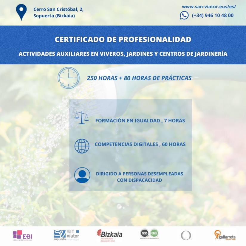 En el marco de programa Lanberri de Acompañamiento a la inserción laboral de personas con discapacidad, vamos a poner en marcha en colaboración con la entidad Talleres Gallarreta un Certificado de Profesionalidad de nivel 1 de ACTIVIDADES AUXILIARES EN VIVEROS, JARDINES Y CENTROS DE JARDINERÍA con prácticas no laborales en empresa. La formación es 100% gratuita y está financiada por la Diputación Foral de Bizkaia. Para mas información contactar con el Centro San Viator en el teléfono 94.610.48.00 o con Talleres Gallarreta en el teléfono: 946 36 24 78.